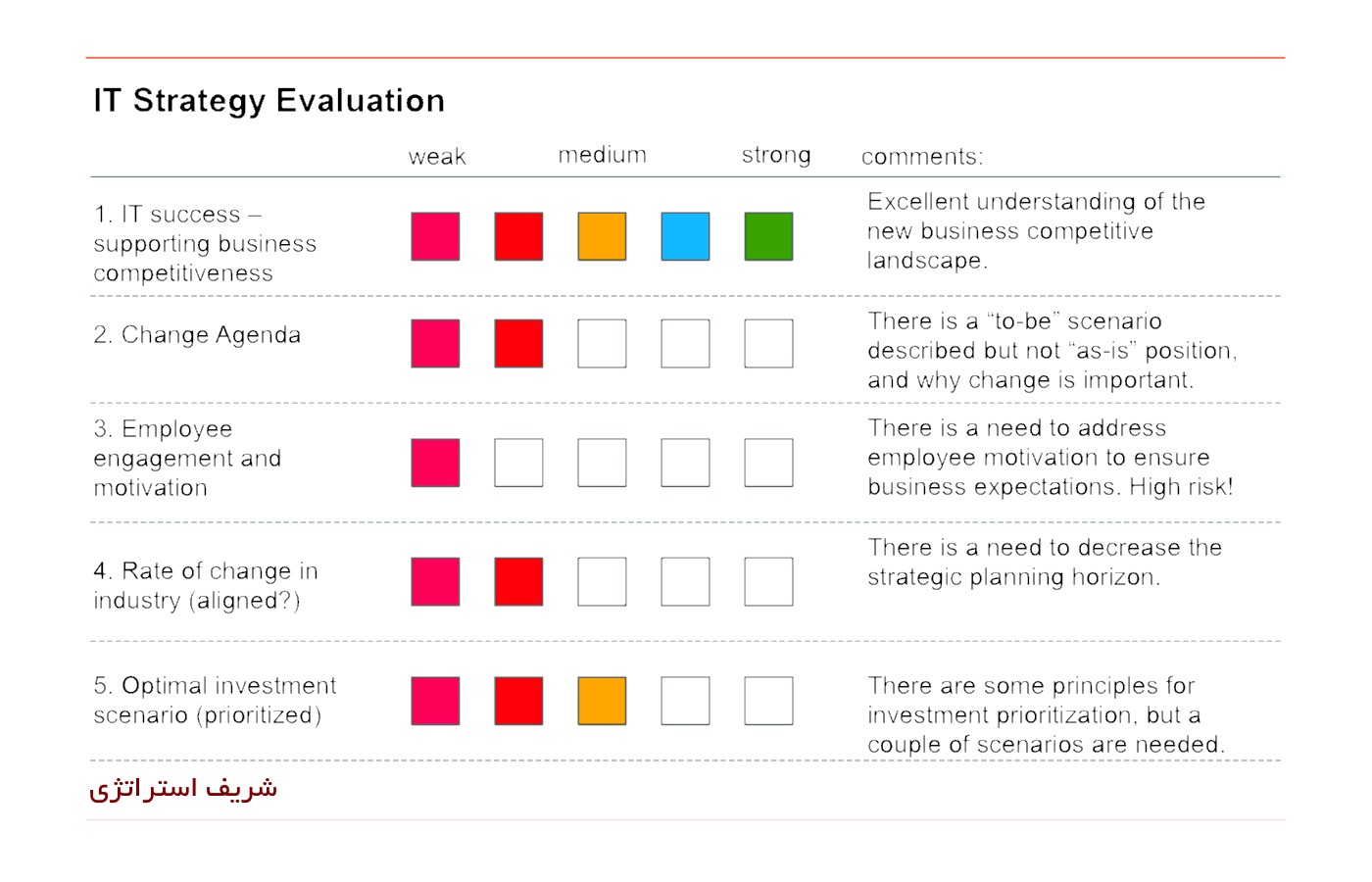 از این رو مقوله کنترل و ارزیابی استراتژی ها که به تمایزدهی عملکرد خوب و بد اختصاص یافته، مدتی است که به عنوان یکی از پرسش های بنیادین تحلیل گران استراتژی مطرح شده است. یکی از بهترین پژوهش های انجام شده متعلق به گروه مشاوران مکنزی است که کنترل و ارزیابی استراتژی ها را بر مبنای پرسش های بنیادین قرار داده اند. نکته جالب توجه آن است که پس از بررسی بیش از دو هزار استراتژی تدوین شده در سطح جهان، تعداد محدودی از آنها توانسته اند بر چالش بیش از چهار پرسش از ده پرسش زیر فایق آیند.