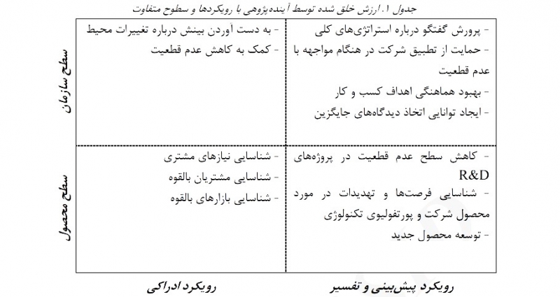 ارزش خلق شده توسط آینده پژوهی از دو منظر رویکرد و سطح فعالیت دسته بندی شده اند. همانطور که در جدول نشان داده شده است، می توان استدلال کرد که آینده پژوهی استراتژیک در دو سطح سازمان و محصول و با دو رویکرد ادراک و پیش بینی (تفسیر) فعالیت می کند. از دیدگاه پیش بینی استراتژیک و مدیریت استراتژیک، آینده پژوهی در سطح سازمان و از دیدگاه مدیریت نوآوری محصولی، آینده پژوهی در سطح محصول قرار می گیرد. در هر دو سطح فعالیت های پایش محیطی، تفسیر داده ها و یادگیری به طور مجزا انجام می گیرند. میتوان گفت که در مراحل پایش محیطی، ادراک و در مرحله تفسیر و یادگیری، پیش بینی صورت می گیرد.